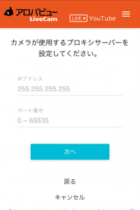 - プロキシサーバーを「使用する」ボタンを押すと、「プロキシサーバー設定」画面が表示されます。プロキシサーバーのIPアドレス、ポート番号を入力し、「次へ」ボタンを押してください。